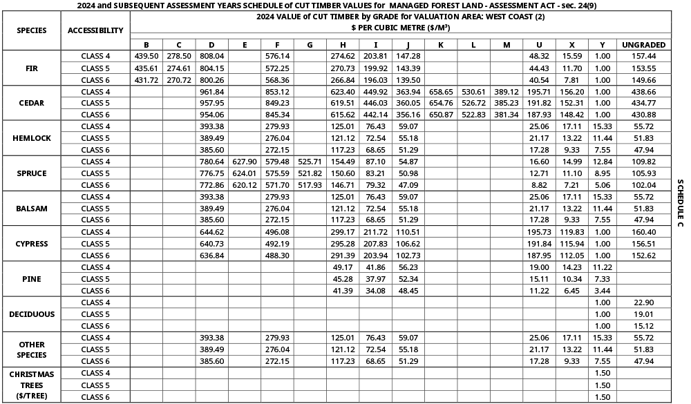 (2) The value of special forest products shall be determined using the rates shown in the column headed "ungraded" for species and grade in Schedule C, or the column headed "sawlog" in Schedule D as appropriate.