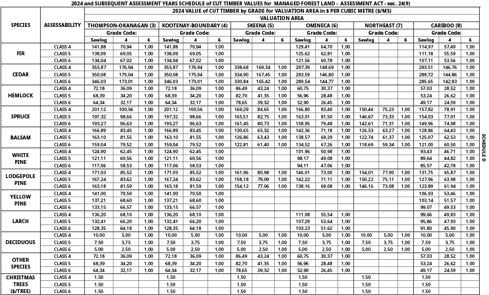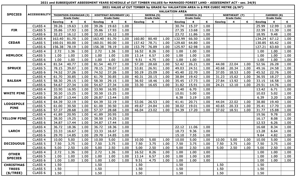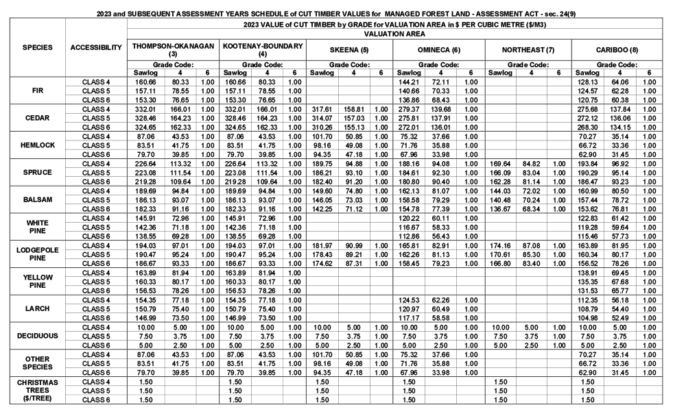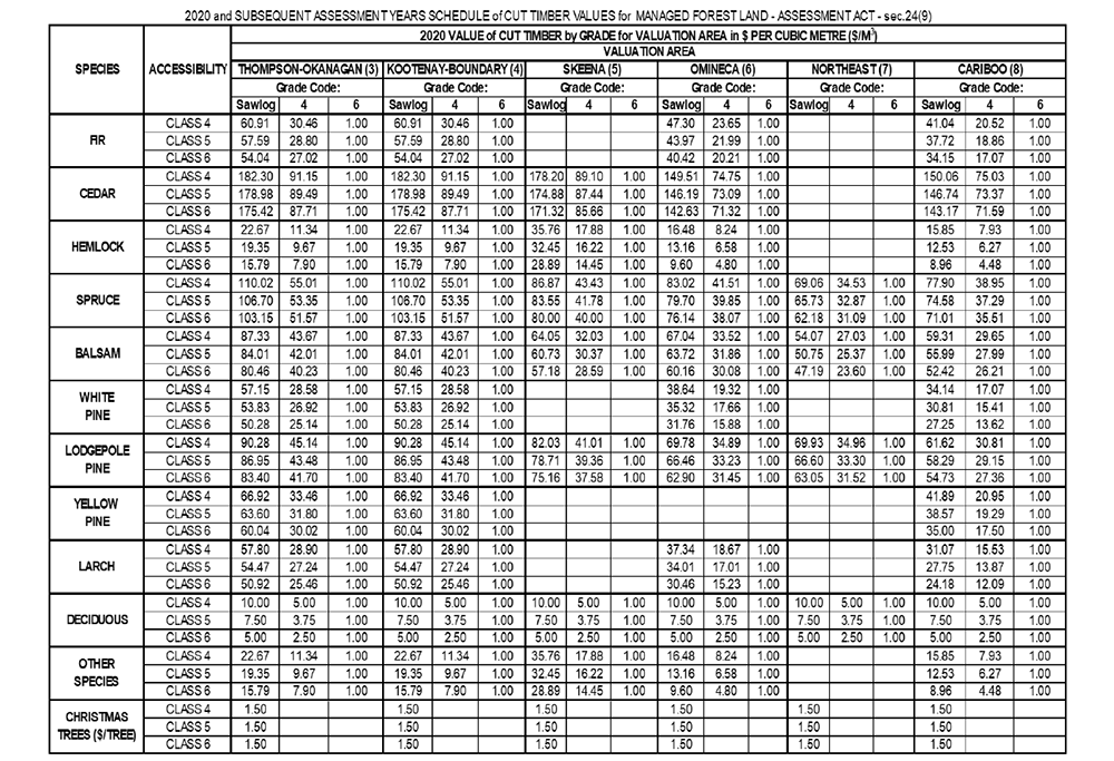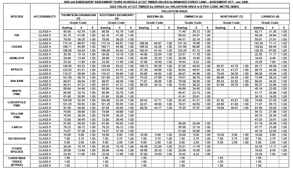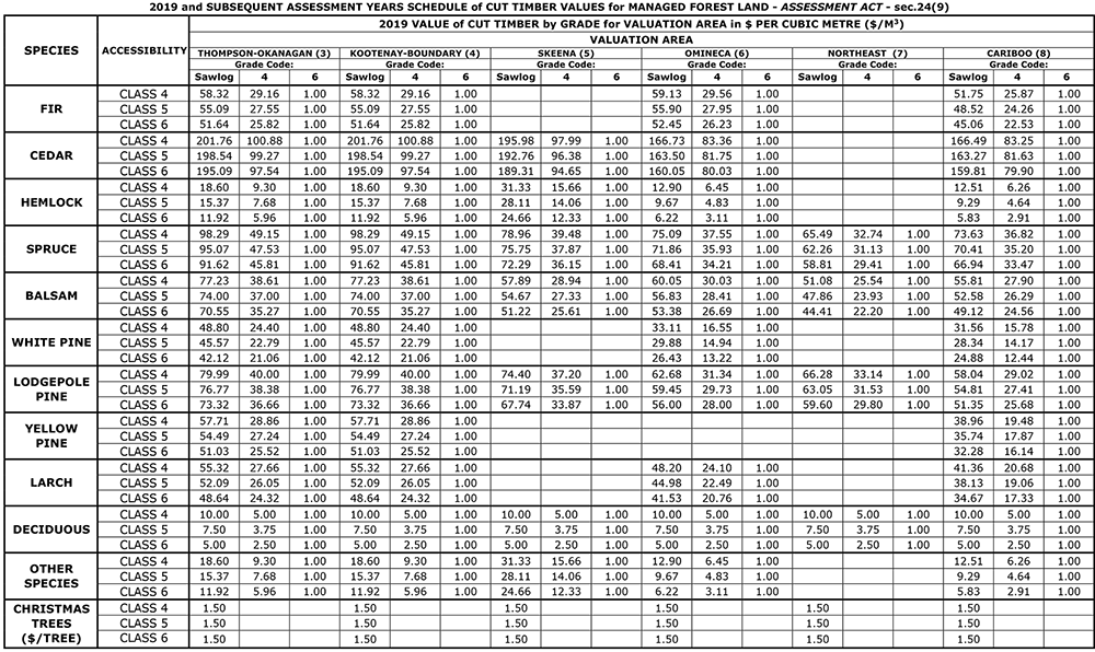 (3) The value of Grade Codes 4 and 5 in an interior area must be set at 50% of the sawlog value, and Grade Code 6 must be given a value of $1.00 per cubic metre or such value as is determined from time to time by the assessment authority.