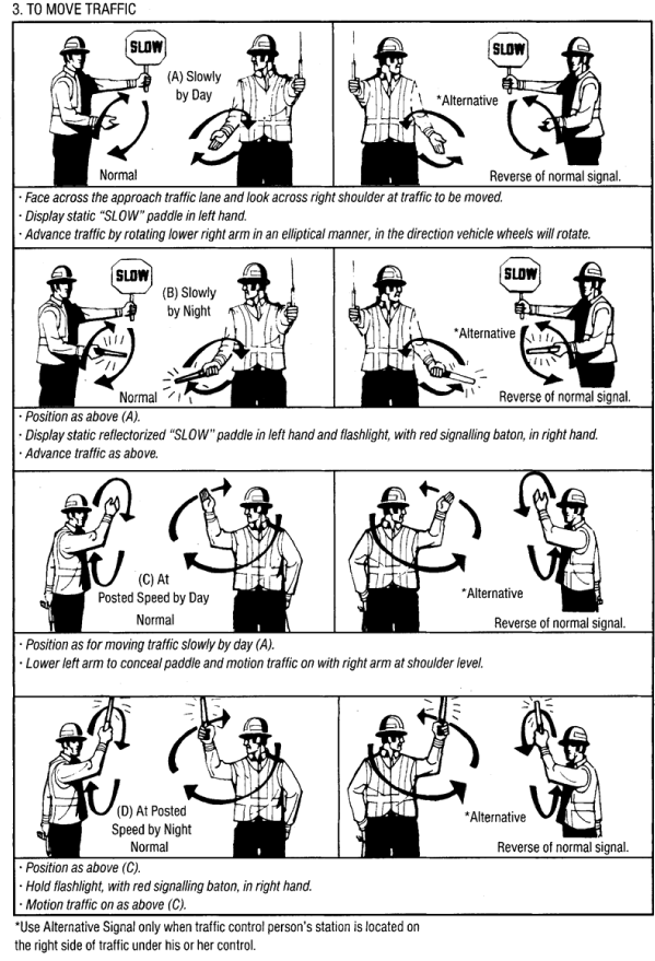 18.14 (1) All traffic control directions and signals made by a traffic control person for the purpose of controlling traffic must conform to the requirements of this Regulation and the Traffic Control Manual.