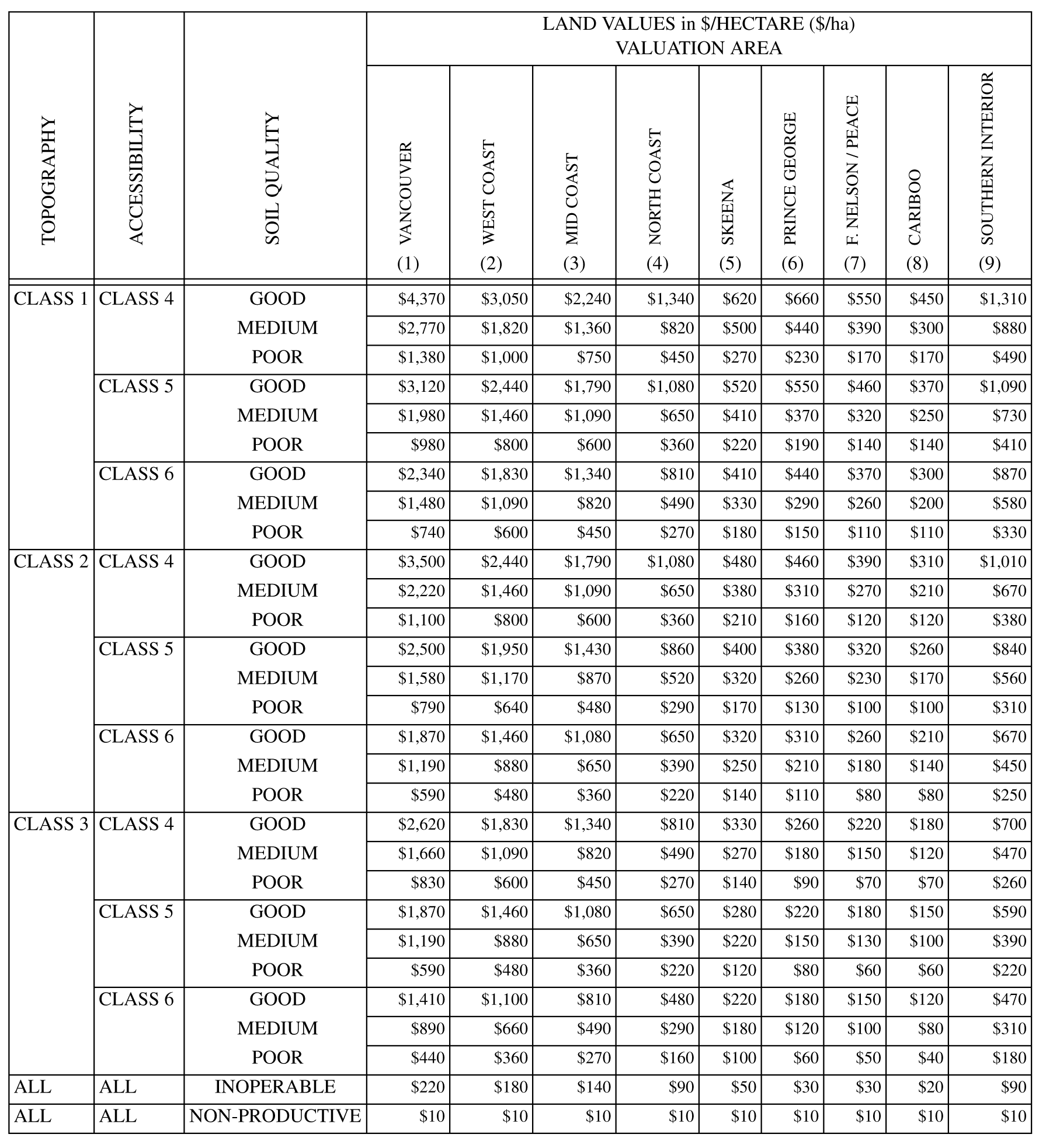 | TOPOGRAPHY | ACCESSIBILITY | SOIL QUALITY | LAND VALUES in $/HECTARE ($/ha) VALUATION AREA |