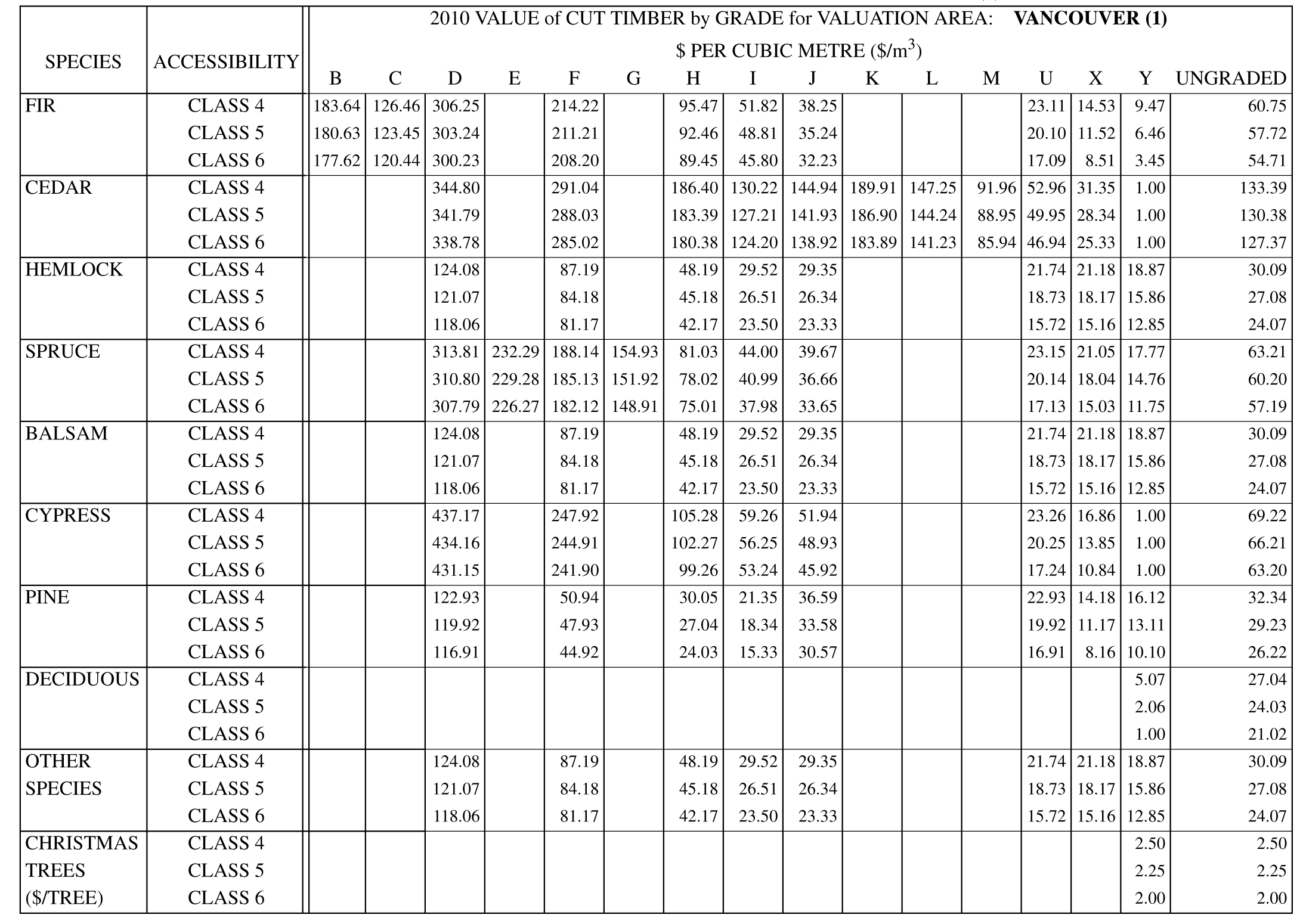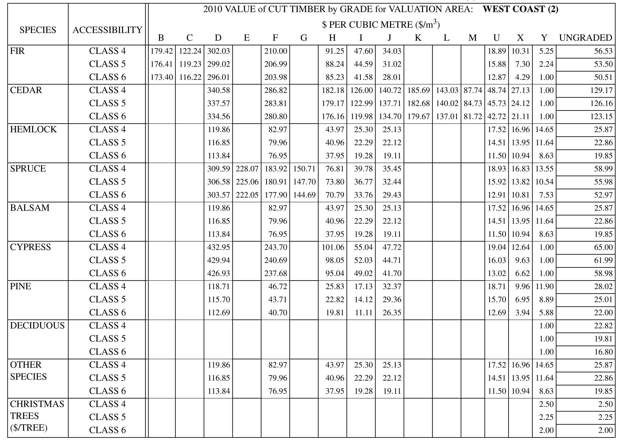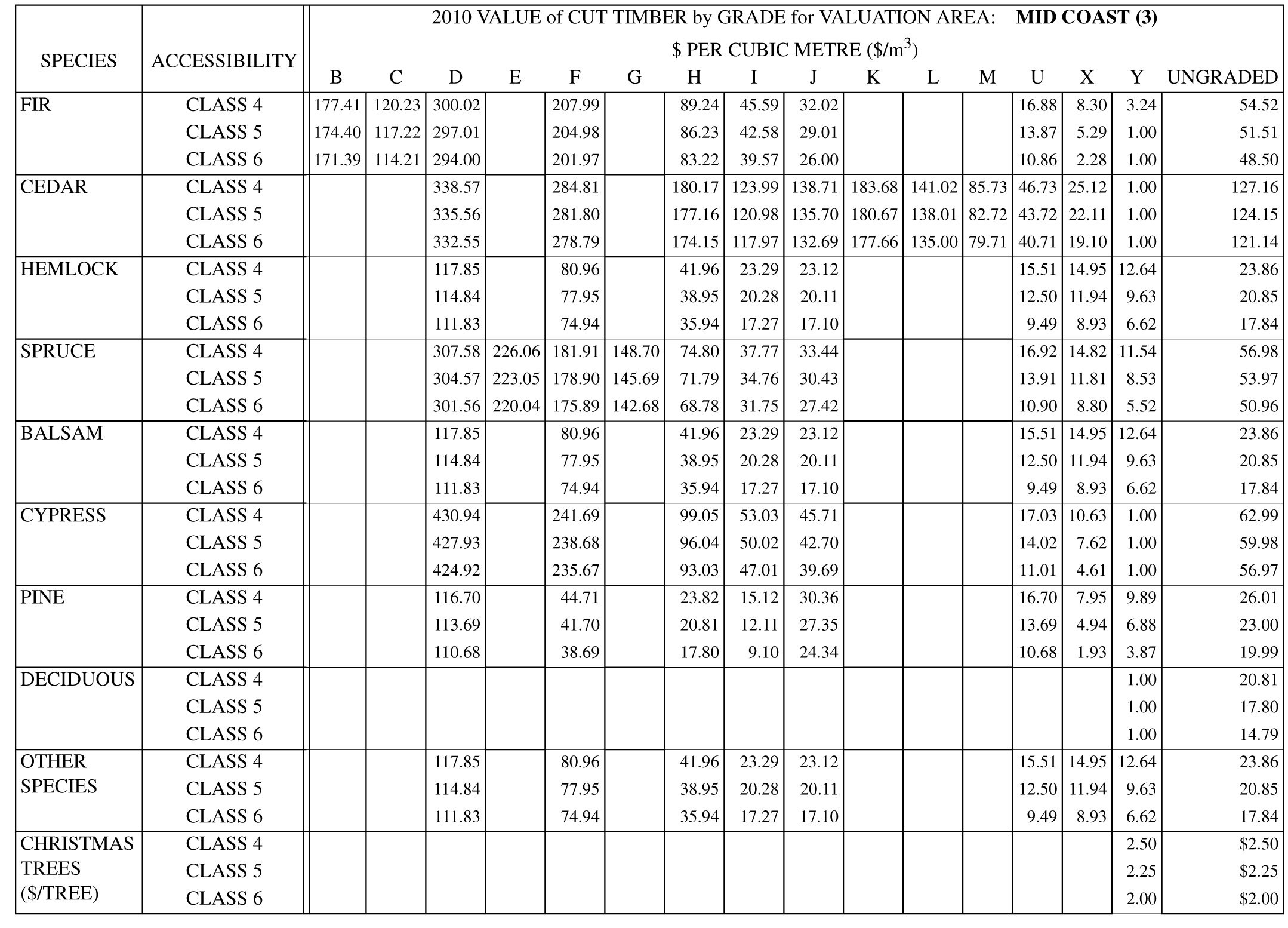| SPECIES | ACCESSIBILITY | 2012 VALUE of CUT TIMBER in $ PER CUBIC METRE ($/m3) | ||||||||||||||