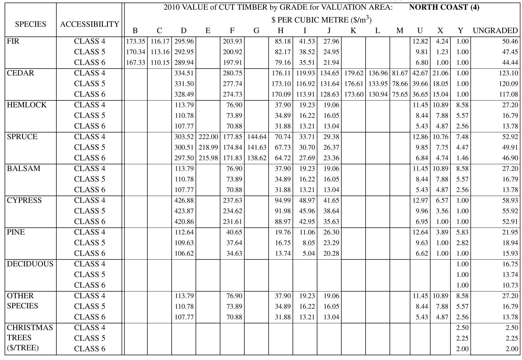 | SPRUCE | CLASS 4 | — | — | $339.90 | $266.44 | $223.19 | $157.19 | $88.18 | $44.73 | $13.43 | — | — | — | $8.49 | $7.72 | $6.57 | $66.54 | |