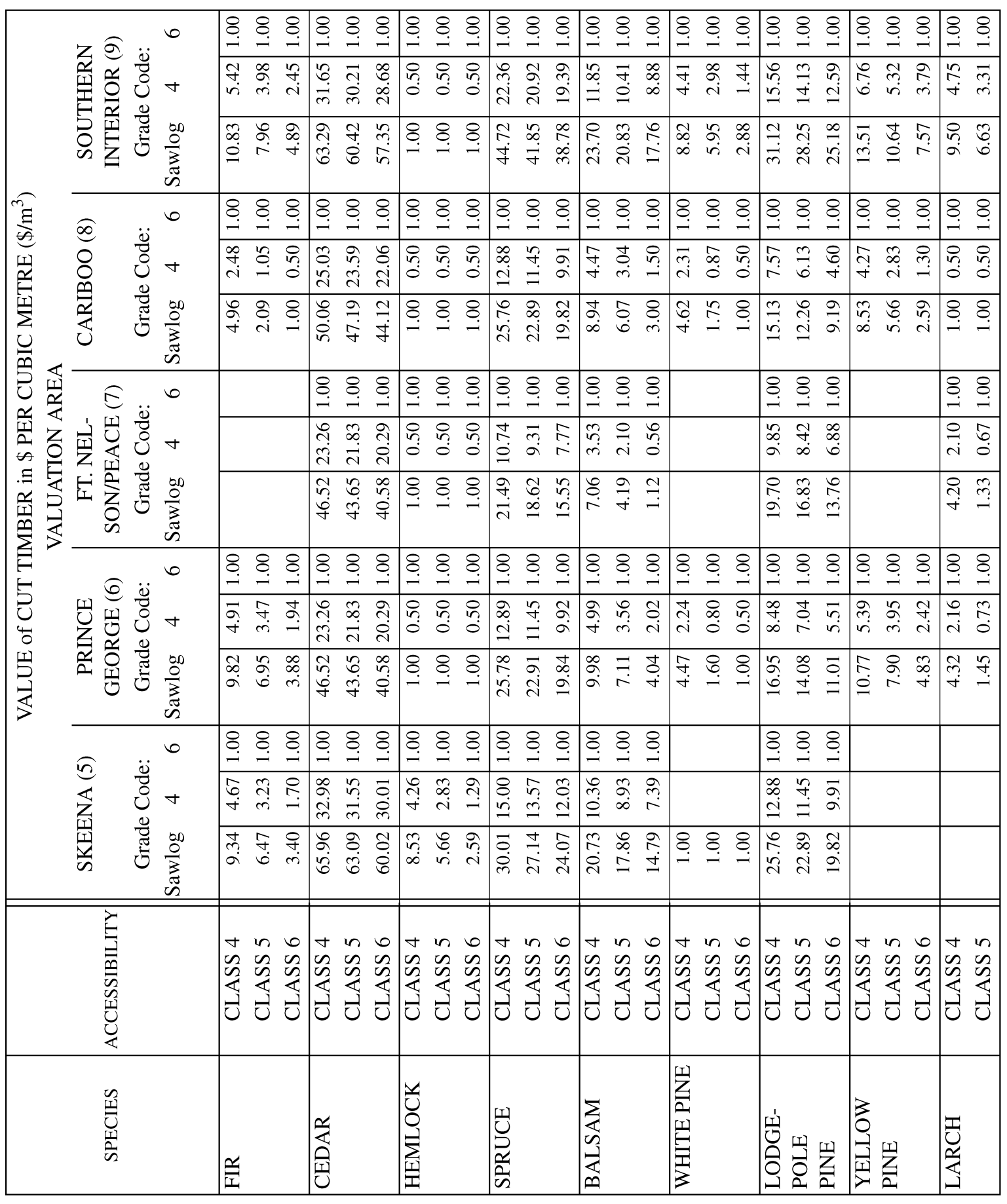 (3) The value of Grade Codes 4 and 5 in an interior area must be set at 50% of the sawlog value, and Grade Code 6 must be given a value of $1.00 per cubic metre or such value as is determined from time to time by the assessment authority.
