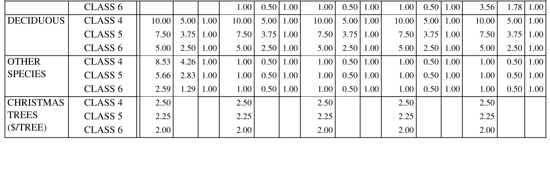 | OTHER SPECIES | CLASS 4 | — | — | $97.09 | — | $70.94 | — | $30.64 | $14.70 | $11.15 | — | — | — | $7.86 | $8.09 | $4.13 | $14.01 | |