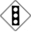 ![]() 75 x 75 cm | SIGNALS AHEAD (Warning) This sign warns of traffic signal lights ahead. Colour: Red, yellow and green discs (top to bottom) in black vertical rectangle. Black border and yellow background. Red, yellow and green reflectorized. | |